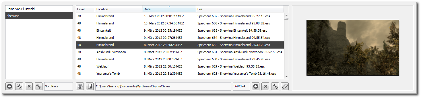 Whenever you click on a savegame, the corresponding screenshot thumbnail is shown to the right (unless you multi-select several savegames). Below the table, the amount of savegames contained in the table in respect with the total amount of savegames is shown. This number changes, if there is a multiselection of characters: In this case, the amount of savegames belonging to the selection in respect with the total amount of savegames is displayed. The buttons to the left below the savegame table let you define Skyrim's savegame folder and force a rescan of this folder. The buttons to the right refer to the currently active selection of savegames.