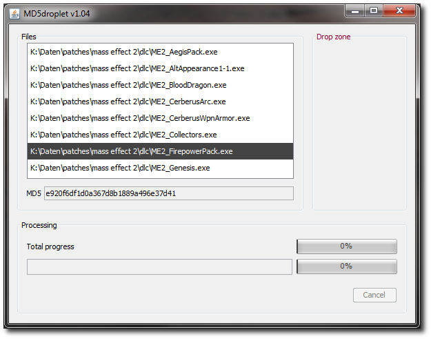 This tool computes MD5 sums for files which are dragged and dropped into the application's drop zone. After processing, the list is populated and you can see a file's MD5 sum by clicking on its list entry.