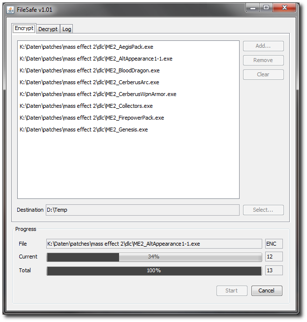 Simply add files to the Encrypt and/or Decrypt tab, define the target directories and hit the start button. After entering your password, the files are processed. Clicking on the Cancel button stops processing.