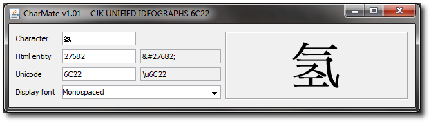 CharMate is useful when encoding Unicode strings for websites or Java sources. You can either enter the character, its html entity code or its Unicode, and the other